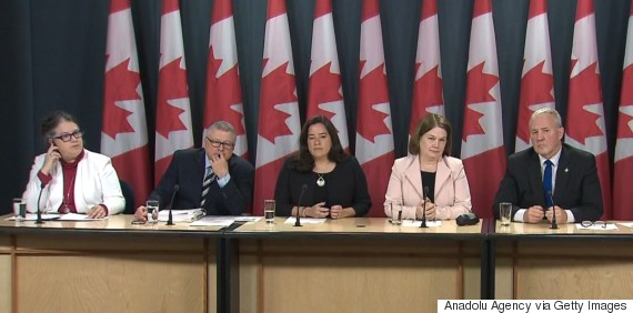 MONTREAL, CANADA – APRIL 13 : The Canadian government members including Minister of National Revenue Diane Lebouthiller (L), Minister of Public Safety Ralph Goodale (2nd L), Minister of Justice Jody Wilson-Raybould (3rd L), Minister of Health Jane Philpott (4th L) and Parliamentary Secretary Bill Blair (5th L) hold a press conference that announcing a new legislation about legalizing marijuana in Montreal, Canada on April 13, 2017. (Photo by Seyit Aydogan/Anadolu Agency/Getty Images)